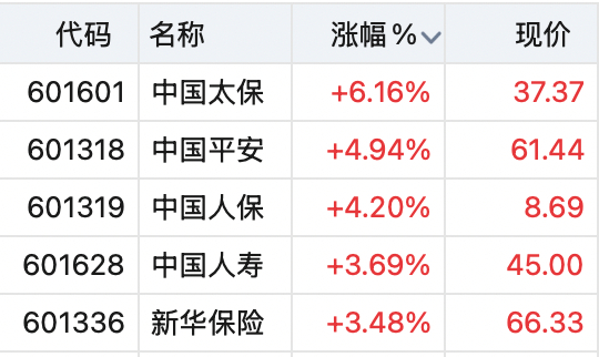 保险股集体上涨,中国太保涨超6%。中国平安、中国人保均涨超4%。