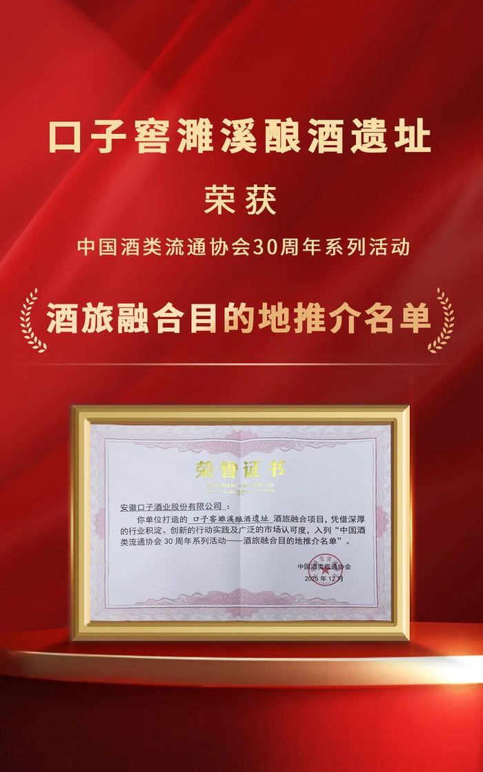 2025年12月4日至5日,以“叁秩成醴·继往开来”为主题的中国酒类流通协会成立30周年主题活动在北京隆重举行。口子窖在此次行业盛典中表现卓越,一举斩获两项重要荣誉:口子窖濉溪酿酒遗址入选“酒旅融合目的地推介名单”,口子窖·兼8成功入选“为生活更美好·酒业未来30产品”推介名单。