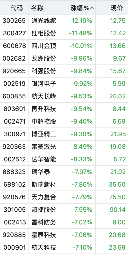 此外,四川金顶跌停,通光线缆、红相股份跌超10%,航天长峰、再升科技、中超控股、博亚精工等均跌超9%。