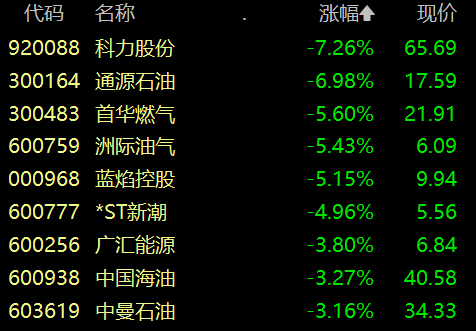 油气板块调整,科力股份跌超7%,通源石油跌超6%,首华燃气、洲际油气跌超5%。