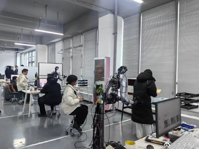1月20日,在合肥零次方机器人有限公司内,具身智能机器人训练师正在进行机器人动作训练。新华社记者张紫赟 摄