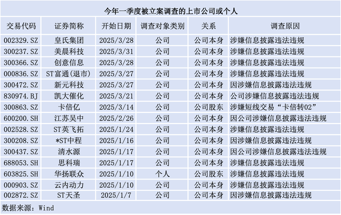 在此背景下,上市公司批量被查。Wind统计显示,今年一季度,有14家A股公司被立案,多涉嫌信息披露违法违规。