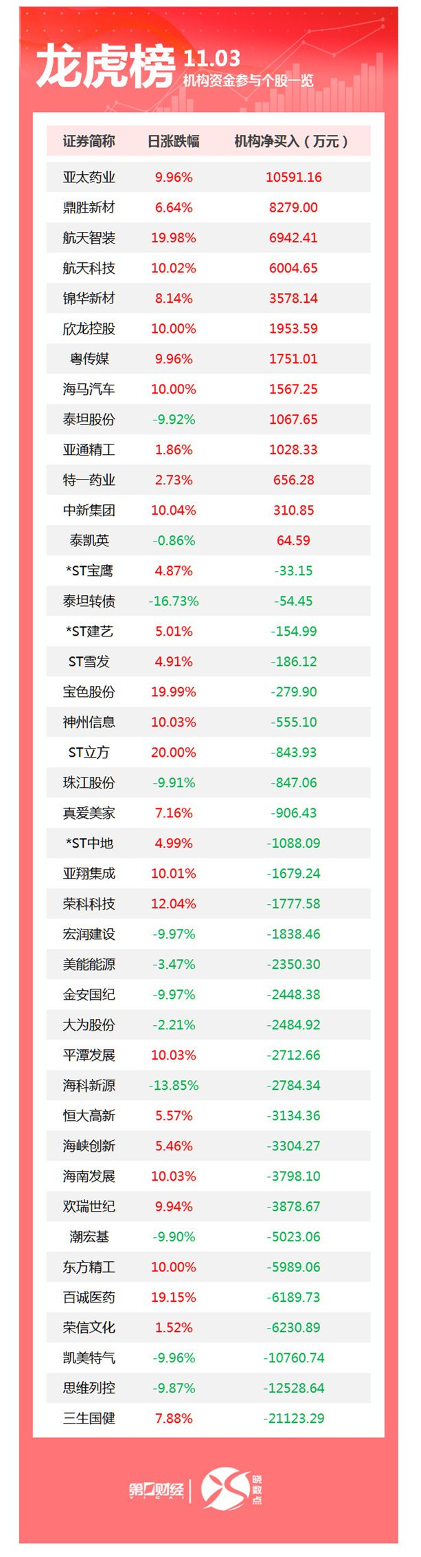 当天机构净买入前三的股票分别是亚太药业、鼎胜新材、航天智装,净买入金额分别是1.06亿元、8279万元、6942万元。