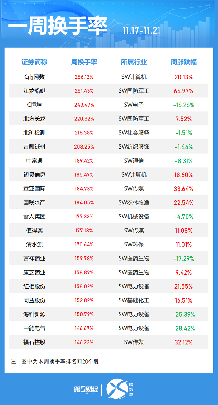 本周共有78只个股换手率超过100%。其中,C南网数排名居首,周换手率达到256.12%,江龙船艇周换手率251.43%,C恒坤周换手率243.47%。