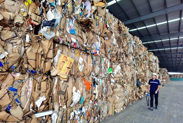 11月23日,第一财经记者随团实地探访浙江景兴纸业股份有限公司马来西亚项目时看到,巨大的厂房内堆着一眼望不到边捆扎结实的废纸原料。工作人员介绍,废纸原料由链板机送入水力碎浆机,分离出金属、塑料、砂石等非纤维杂质,并通过不同设备分别排出。