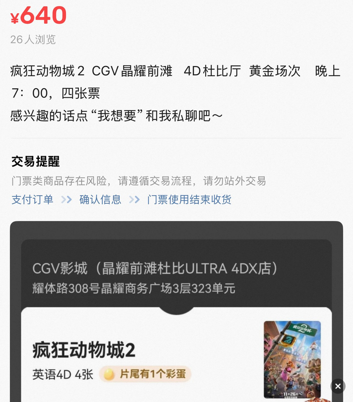 正因4D电影场一票难求,《疯狂动物城2》4D场的票开始出现了加价交易,第一财经记者在部分渠道看到有人直接将原价109元的4D票以160元的价格出售,相当于加价47%。