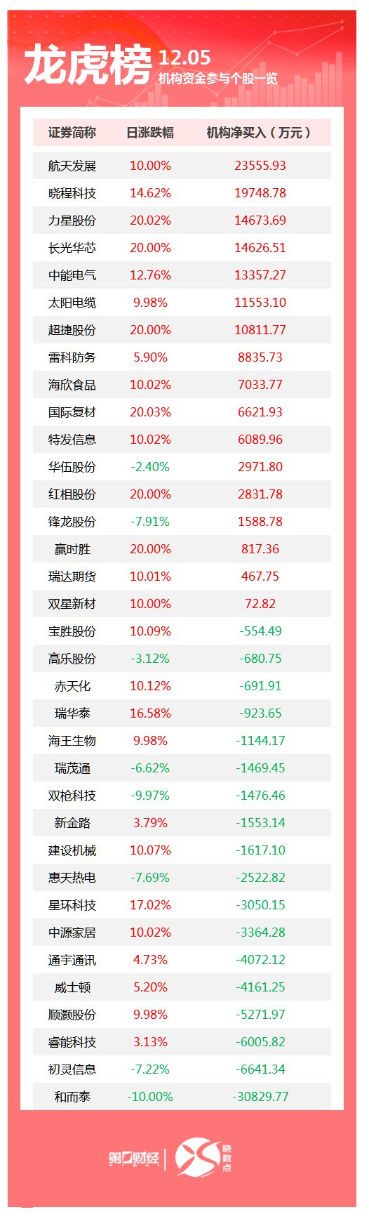 当天机构净买入前三的股票分别是航天发展、晓程科技、力星股份,净买入金额分别是2.36亿元、1.97亿元、1.47亿元。
