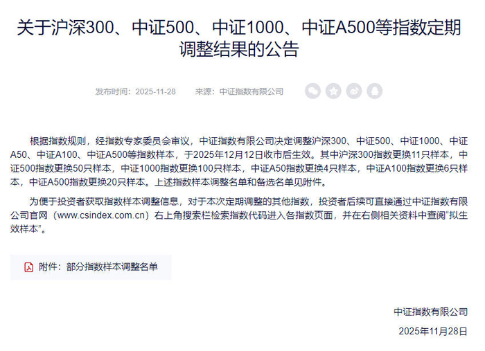 11月末,沪深交易所、中证指数有限公司(下称“中证指数”)、深圳证券信息有限公司(下称“深证信息”)等集中公告,根据指数规则,对A股多个核心指数进行样本股定期调整。