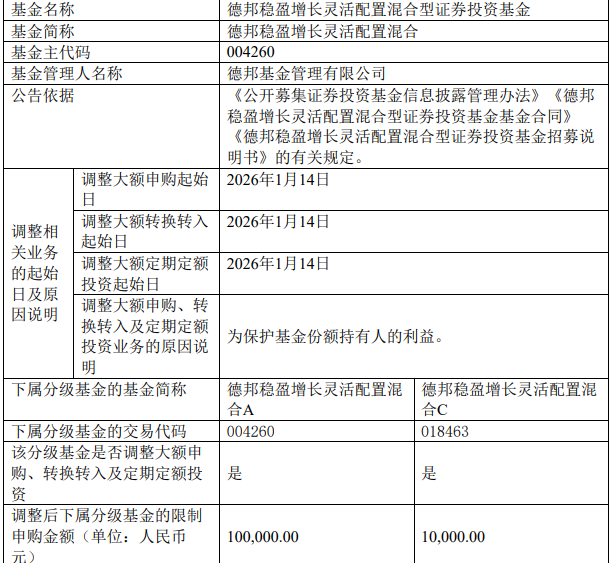 1月13日早盘,德邦基金公告称,旗下德邦稳盈增长即日起在单一销售机构的大额申购(含转换转入及定期定额投资)业务限额进行调整,A类份额限购1000万元,C类份额限购100万元。当日盘后再发公告,宣布14日起限购金额将大幅收紧至10万元与1万元。