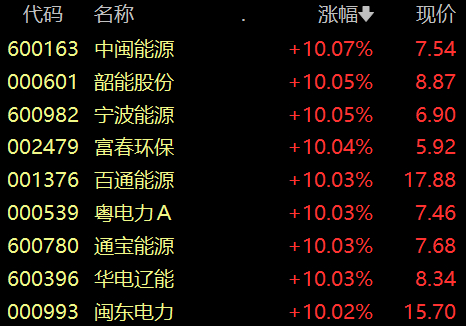 具体来看,电力板块掀涨停潮,中闽能源、韶能股份、宁波能源、百通能源等多股涨停。