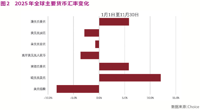 2025年人民币汇率整体处于升值趋势。由于2025年美元走势偏弱,主要非美货币(均考虑与美元的双边汇率)都出现不同程度的升值,截至11月30日,2025年欧元升值12.1%,英镑和澳元都升值了5.8%,加元升值了2.9%,日元升值幅度最小,仅有0.7%,离岸人民币汇率升值约3.6%。