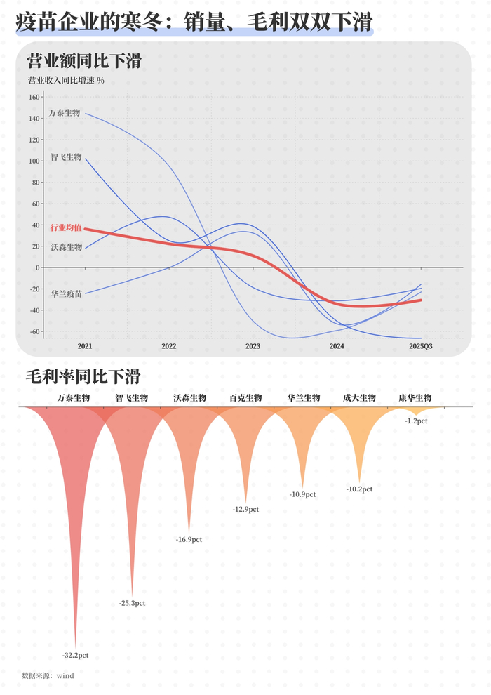 36氪制图需求疲软与价格下行叠加,使企业盈利能力持续承压。数据显示,七家头部疫苗企业净利率平均下降约46个百分点,其中三家已出现亏损。