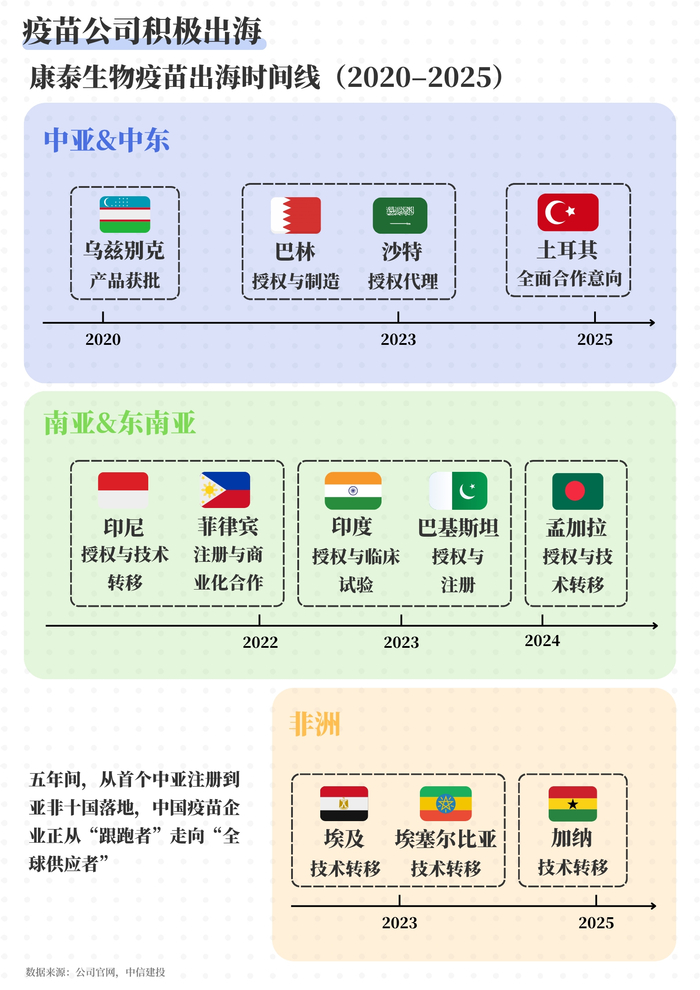 36氪制图在国内市场竞争加剧的背景下,疫苗企业正加速出海。以康泰生物为例,其23价肺炎疫苗2020年在乌兹别克斯坦取得注册证书后,业务已拓展至亚非多国,海外市场正成为新的增长引擎。
