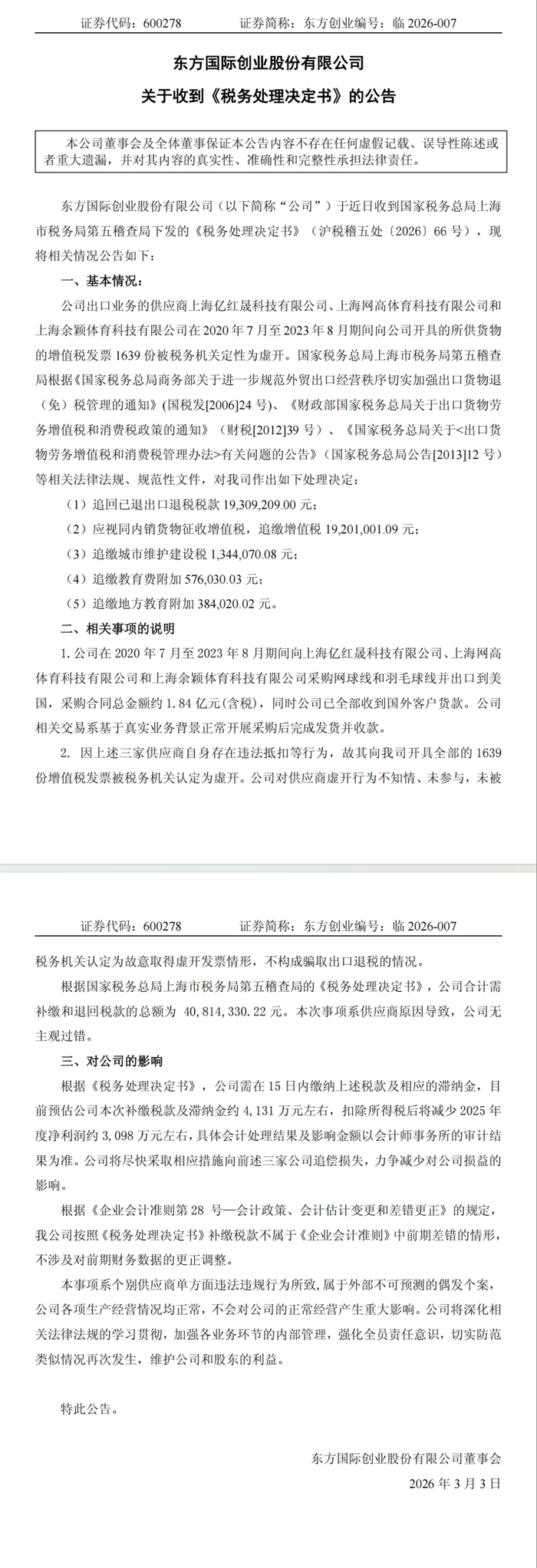 根据公司公告,税务机关认定东方创业2020年7月至2023年8月期间的三家供应商,合计开具的1639份增值税发票属于“虚开”。基于此,其被要求追回已退的出口退税、补缴增值税及附加税费,合计金额为4081.43万元。