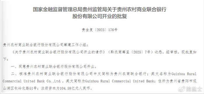 12月15日,国家金融监督管理总局贵州监管局的一纸批复,让贵州农商联合银行正式获准开业。这家注册资本达104.58亿元的省级金融机构,股权结构中出现了一个熟悉的身影——中国贵州茅台酒厂(集团)有限责任公司。