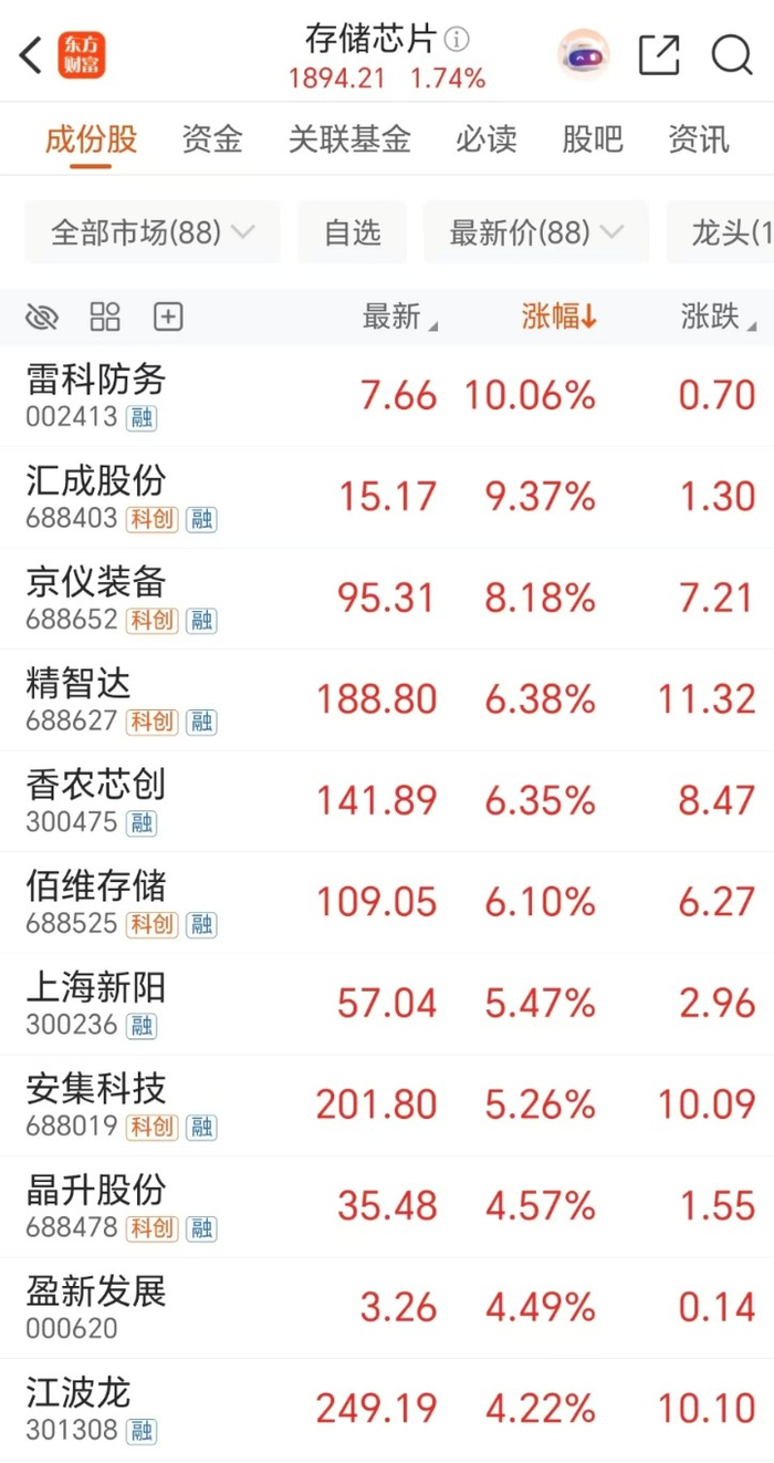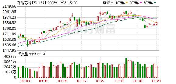 周五(11月28日)存储概念股收涨1.7%,个股方面,雷科防务涨停,汇成股份涨超9%,京仪装备、精智达、香农芯创、佰维存储等个股涨超6%。