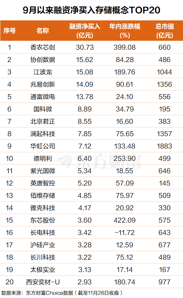 东方财富Choice数据显示,自今年9月以来,杠杆资金净买入多只存储概念股,香农芯创排名第一,融资净买入31亿元;协创数据排名第二,融资净买入16亿元。
