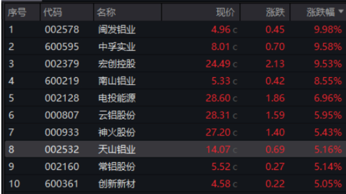 12月5日,A股电解铝板块全线大涨。闽发铝业涨停,中孚实业、宏创控股、南山铝业等9只股票涨幅超过5%。