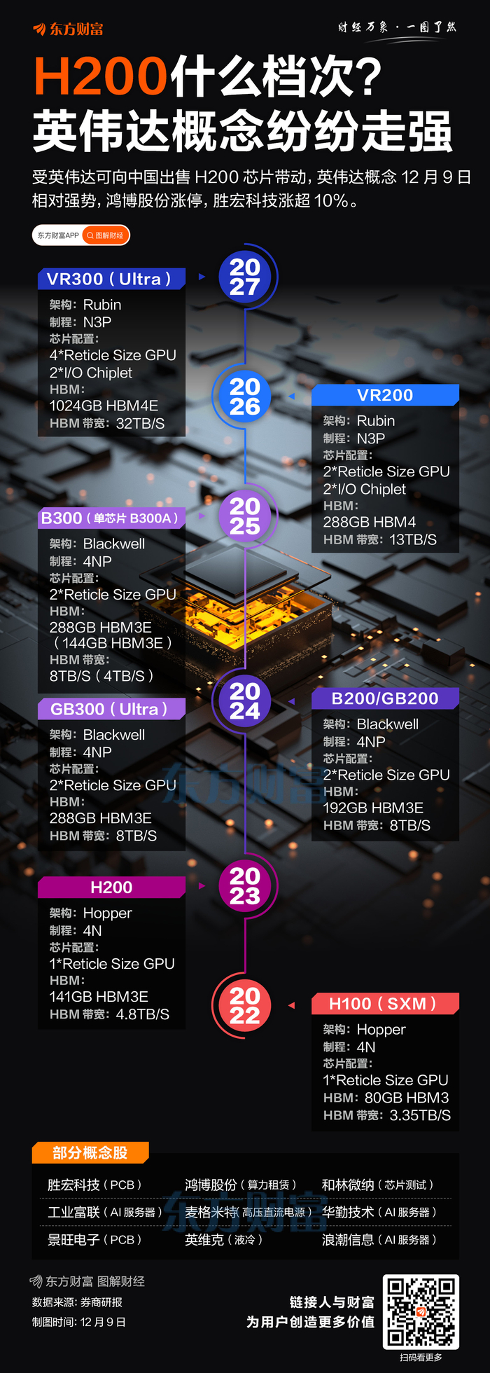 部分英伟达概念股12月9日表现强势,鸿博股份涨停,胜宏科技大涨超10%,和林微纳、工业富联也明显拉升。