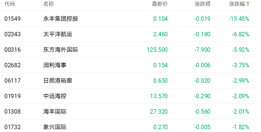 截至收盘,东方海外国际(00316.HK)跌6.82%、东方海外国际(00316.HK)跌5.92%、中远海控(01919.HK)跌2.01%。