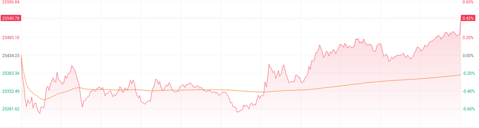 港股三大指数集体收红。截至收盘,恒生指数涨0.42%,报25540.78点;科技指数涨0.48%,报5581.10点;国企指数涨0.20%,报8954.69点。