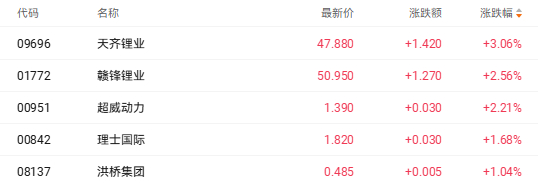 截至收盘,天齐锂业(09696.HK)涨3.06%、赣锋锂业(01772.HK)涨2.56%、超威动力(00951.HK)涨2.21%。