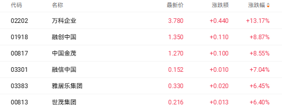截至收盘,万科企业(02202.HK)涨13.17%、融信中国(03301.HK)涨8.87%、融创中国(01918.HK)涨7.04%。