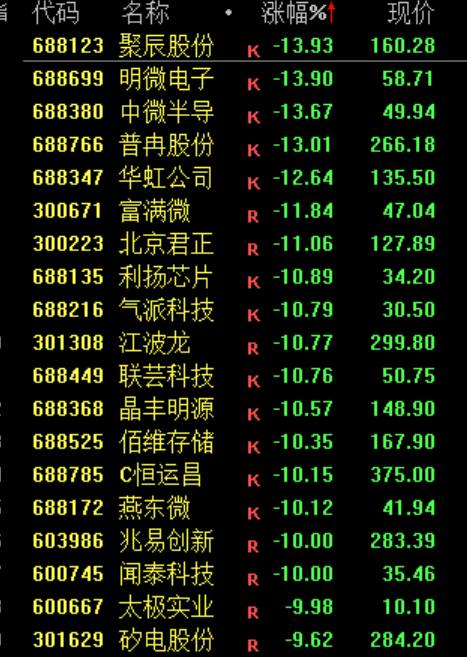 半导体芯片股下挫,兆易创新、闻泰科技等跌停,华虹公司、北京君正等跌超10%。