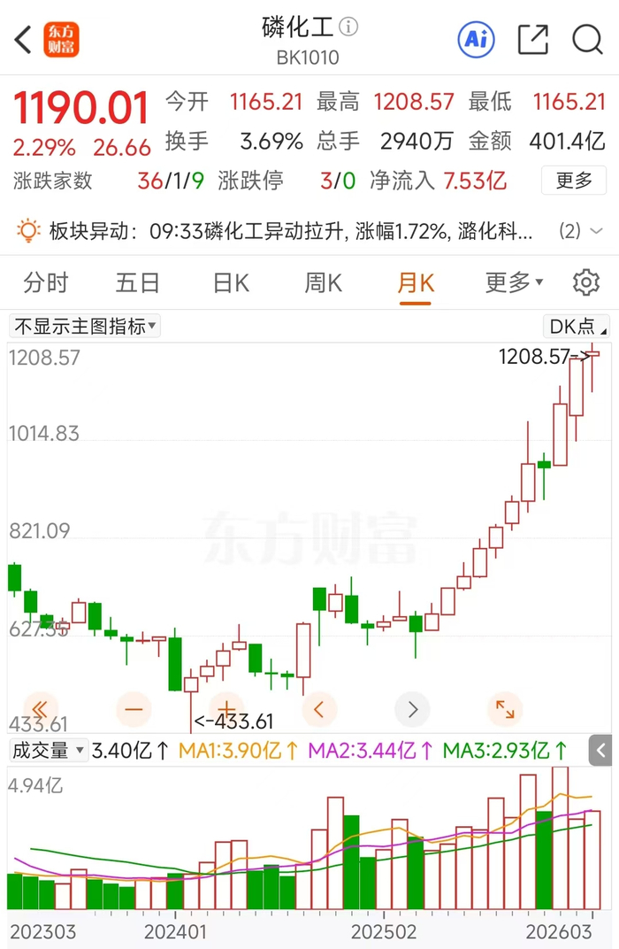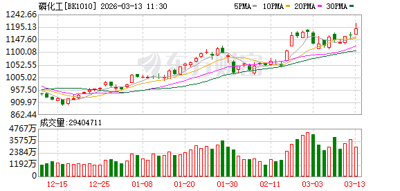 从K线图来看,磷化工自2025年以来加速上涨,其中2025年上涨47.04%,2026年以来已上涨24.04%(截至3月13日早盘收盘)。且3月13日早盘,磷化工指数再创历史新高。