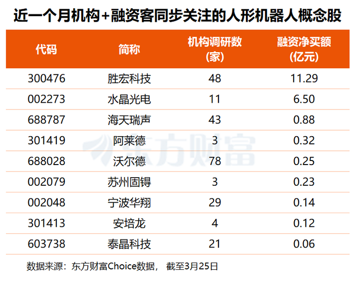 东方财富Choice数据显示,近一个月来,共有9只人形机器人概念股获得机构调研,同时还获得杠杆资金加仓。其中,胜宏科技获融资客大举抢筹超11亿元,水晶光电融资净买额约6.5亿元,海天瑞声获融资净买入0.88亿元,阿莱德、沃尔德、宁波华翔等5股均获杠杆资金超千万元加仓。