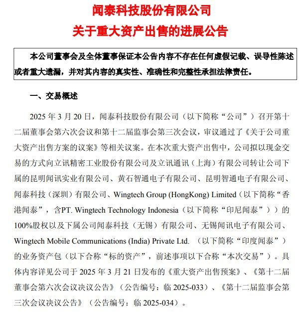 【闻泰科技披露向立讯精密重大资产出售进展:仅印度尾款约 1.61 亿元未付,将继续与对方积极沟通】闻泰科技发布公告,拟向立讯精密等转让多家公司股权及业务资产包,印度闻泰相关业务资产包已完成转移,仅土地权属变更待完成。公司已收到大部分交易价款,剩余尾款仍在沟通中。#闻泰科技# #立讯精密#