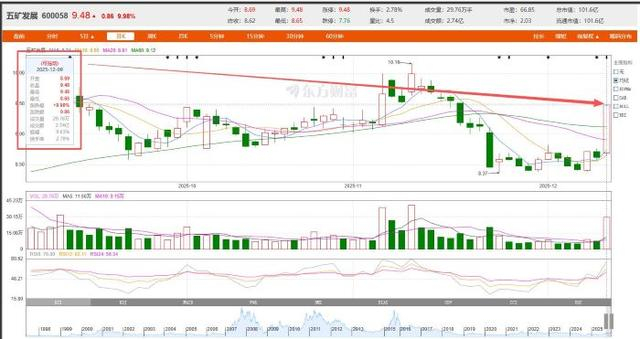 12月9日早盘的A股市场,五矿系两家上市公司的股价走势呈现戏剧性分化。五矿发展盘中震荡上行,上午10时后短短10分钟内,先遭遇2.29万手大单抛售,随即被2.28万手买单承接,股价迅速冲至10%涨停板。
