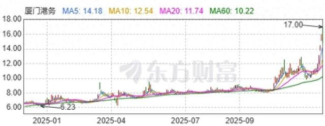 2025年已经接近尾声,厦门港务以一匹“黑马”之姿强势突围,成为近期资本市场的热点。12月10日,该股再度以15.97元/股涨停价报收,实现连续第四个交易日涨停,股价较12月4日的10.91元/股累计飙升46.38%。尽管12月11日稍微有所回撤,但厦门港务年内股价涨幅已经高达115.6%(前复权,下同)。