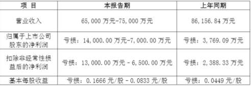 同期,归属于上市公司股东的净利润预计亏损7000万元至1.4亿元,上年同期亏损3769.09万元;扣除非经常性损益后的净利润预计亏损6500万元至1.3亿元,上年同期亏损2388.33万元。