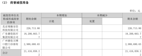此外皓宸医疗的商誉还包括北京瑞驰安信科技有限公司,商誉原值22.67万元,已全额计提减值;广州德伦万博口腔门诊部有限公司,商誉原值298.87万元,已全额计提减值。