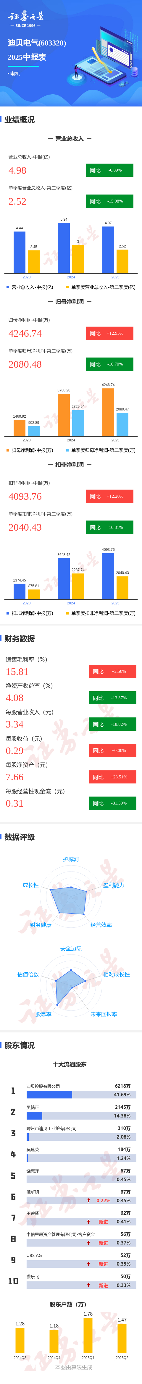 证券之星消息,迪贝电气2025年中报显示,公司主营收入4.98亿元,同比下降6.89%;归母净利润4246.74万元,同比上升12.94%;扣非净利润4093.76万元,同比上升12.21%;其中2025年第二季度,公司单季度主营收入2.52亿元,同比下降15.98%;单季度归母净利润2080.48万元,同比下降10.71%;单季度扣非净利润2040.43万元,同比下降10.81%;负债率15.94%,投资收益178.7万元,财务费用-355.37万元,毛利率15.81%。