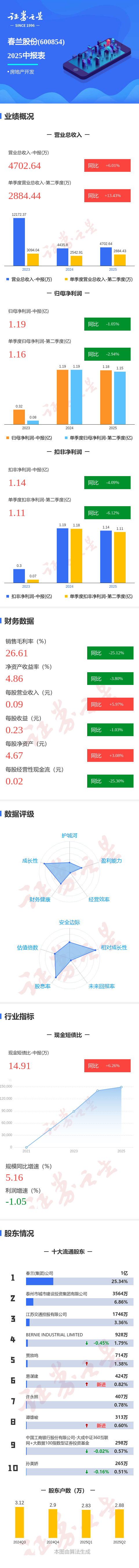 证券之星消息,春兰股份2025年中报显示,公司主营收入4702.64万元,同比上升6.02%;归母净利润1.19亿元,同比下降1.05%;扣非净利润1.14亿元,同比下降4.09%;其中2025年第二季度,公司单季度主营收入2884.44万元,同比上升13.43%;单季度归母净利润1.16亿元,同比下降2.94%;单季度扣非净利润1.11亿元,同比下降6.13%;负债率6.99%,投资收益1.18亿元,财务费用-1544.19万元,毛利率26.61%。