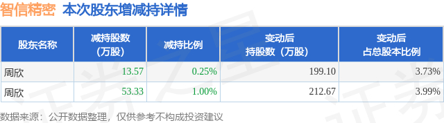 证券之星消息,9月18日智信精密发布公告《智信精密:关于特定股东减持股份计划实施完成的公告》,其股东周欣于2025年6月19日至2025年9月17日间合计减持66.9万股,占公司目前总股本的1.2543%,变动期间该股股价上涨17.56%,截止9月17日收盘报48.0元。