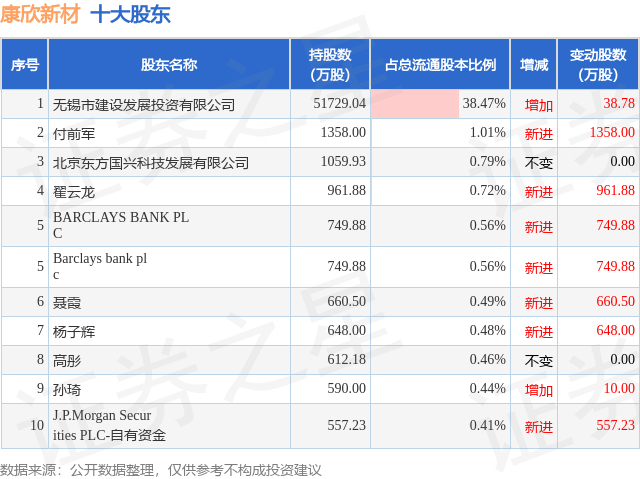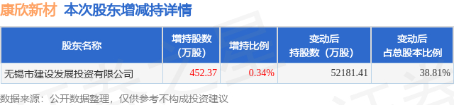 证券之星消息,10月10日康欣新材发布公告《康欣新材:关于控股股东增持公司股份计划时间过半暨增持进展的公告》,其股东无锡市建设发展投资有限公司于2025年4月30日至2025年10月9日间合计增持452.37万股,占公司目前总股本的0.3364%,变动期间该股股价上涨41.29%,截止10月9日收盘报2.84元。