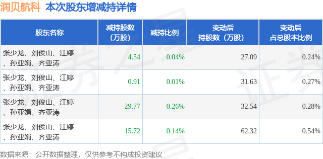 证券之星消息,10月14日润贝航科发布公告《润贝航科:润贝航空科技股份有限公司关于公司股东减持股份计划期限届满暨实施结果的公告》,其股东张少龙、刘俊山、江婷、孙亚娟、齐亚涛于2025年7月14日至2025年10月13日间合计减持50.95万股,占公司目前总股本的0.4425%,变动期间该股股价上涨1.62%,截止10月13日收盘报33.3元。