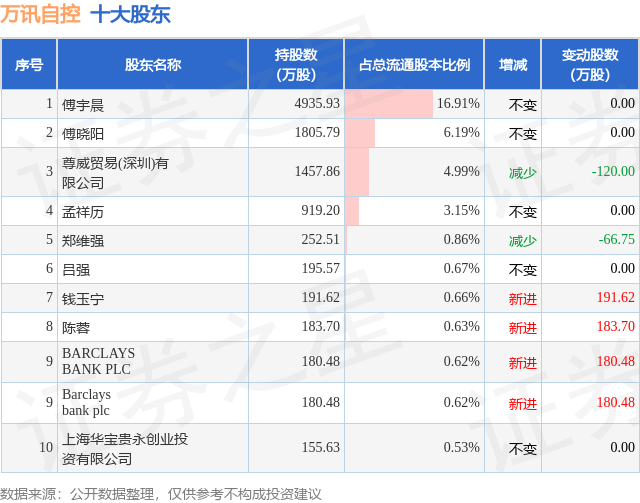 根据万讯自控2025年中报公布的十大股东详情如下: