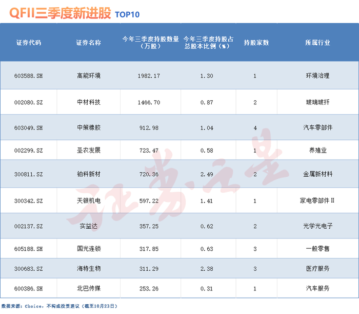 除此之外,还有中策橡胶、圣农发展、铂科新材、天银机电、实益达、国光连锁等成QFII三季度新进持仓股,涵盖了环境治理、玻璃玻纤、汽车零部件、养殖业、金属新材料、家电零部件Ⅱ、光学光电子等行业,代表了外资对不同细分领域机会的挖掘。