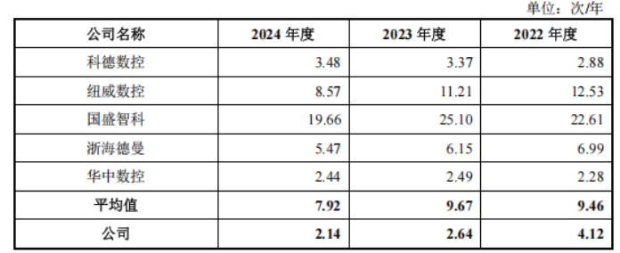 在账龄结构恶化的同时,钶锐锶应收账款周转效率也在同步下滑,进一步反映出资金回收能力的减弱。报告期内,公司应收账款周转率分别为4.12次/年、2.64次/年、2.14次/年,周转率趋缓的原因主要是报告期内应收账款增长幅度大于营收增长幅度。值得一提的是,其周转率远低于可比公司均值的9.46次/年、9.67次/年、7.92次/年,2023年及2024年周转率不到可比公司均值的三分之一。