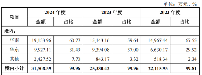 数据显示,钶锐锶超九成收入来自于华南、华东。其中,报告期内来自华南的销售收入分别为1.5亿元、1.51亿元、1.92亿元,营收占比分别为67.55%、59.64%、60.77%,2023年下滑后又有小幅攀升。同期华东的销售收入分别为6630.17万元、9394.08万元、9927.11万元,营收占比则分别为29.92%、37%、31.49%。