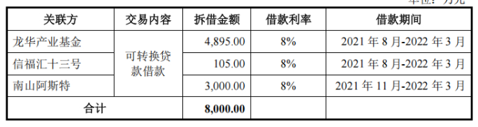 为了完成此次收购,钶锐锶于2021年向龙华产业基金、信福汇十三号、南山阿斯特3名股东合计借款8000万元,借款利率高达8%。上述借款发生年度1年期贷款市场报价利率范围为3.65%-3.8%,与钶锐锶借款利率差异幅度在4.2%-4.35%。