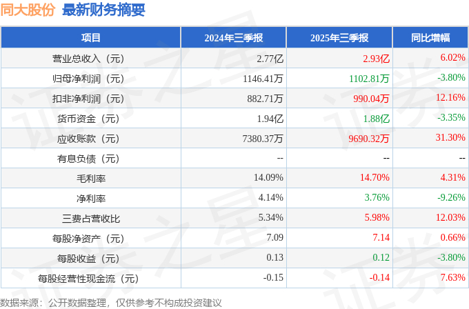 据证券之星公开数据整理,近期同大股份(300321)发布2025年三季报。截至本报告期末,公司营业总收入2.93亿元,同比上升6.02%,归母净利润1102.81万元,同比下降3.8%。按单季度数据看,第三季度营业总收入9815.78万元,同比上升16.56%,第三季度归母净利润264.27万元,同比上升13.01%。本报告期同大股份应收账款上升,应收账款同比增幅达31.3%。