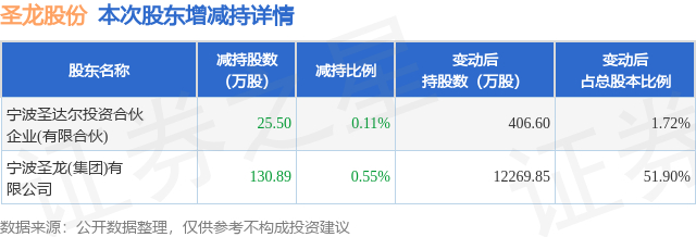 证券之星消息,10月24日圣龙股份发布公告《圣龙股份:圣龙股份关于控股股东及其一致行动人权益变动触及1%刻度的提示性公告》,其股东宁波圣龙(集团)有限公司、宁波圣达尔投资合伙企业(有限合伙)于2025年10月23日至2025年10月24日间合计减持156.39万股,占公司目前总股本的0.6615%,变动期间该股股价上涨11.88%,截止10月24日收盘报22.88元。
