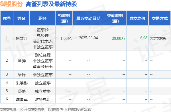 证券之星消息,根据10月24日市场公开信息、上市公司公告及交易所披露数据整理,御银股份(002177)最新董监高及相关人员股份变动情况:2025年10月23日公司董事,高管杨文江共减持公司股份12.71万股,占公司总股本为0.0167%。变动期间公司股价下跌7.15%,10月23日当日收盘报7.4元。