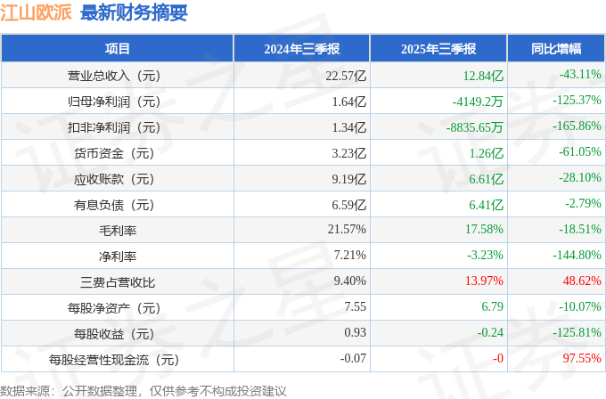 据证券之星公开数据整理,近期江山欧派(603208)发布2025年三季报。截至本报告期末,公司营业总收入12.84亿元,同比下降43.11%,归母净利润-4149.2万元,同比下降125.37%。按单季度数据看,第三季度营业总收入4.16亿元,同比下降48.92%,第三季度归母净利润-5157.96万元,同比下降187.96%。本报告期江山欧派三费占比上升明显,财务费用、销售费用和管理费用总和占总营收同比增幅达31.3%。