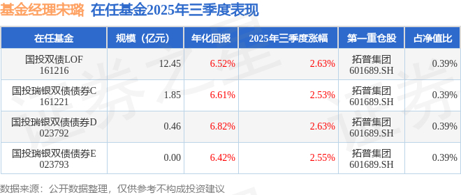 证券之星消息,截止2025年三季度末,基金经理宋璐旗下共管理4只基金,本季度表现最佳的为国投双债LOF(161216),季度净值涨2.63%。